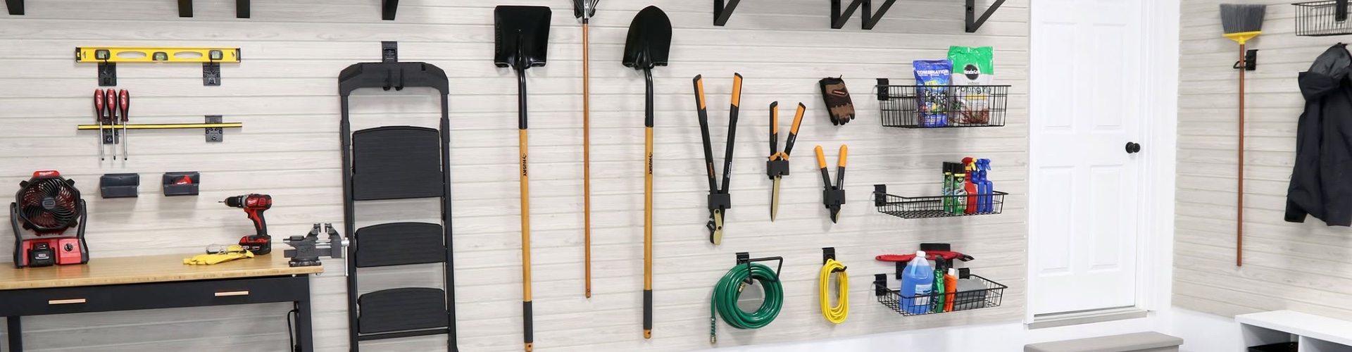 Baskets are ideal for grab-and-go storage—gloves, balls, kids’ gear, cleaning supplies, and other items that don’t hang well. Choose the basket bundle size that matches your wall layout and storage needs.